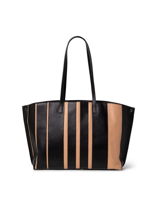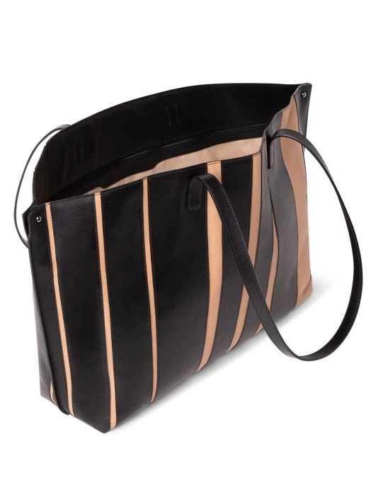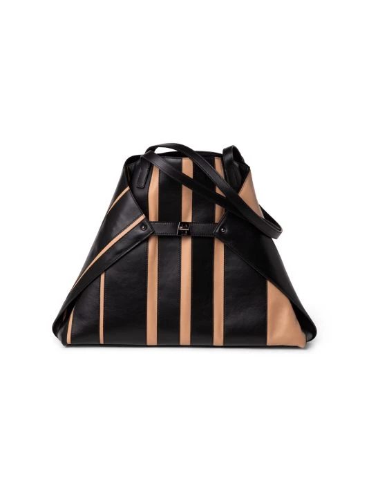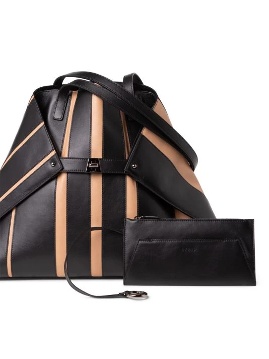 The Ai top-handle bag from Akris punto is crafted of contrasting paneled leather. This convertible trapezoid style is finished with a turn-lock belt that folds down the sides and buckles in the front.