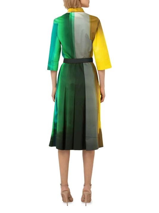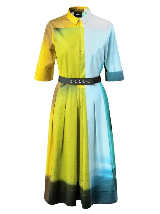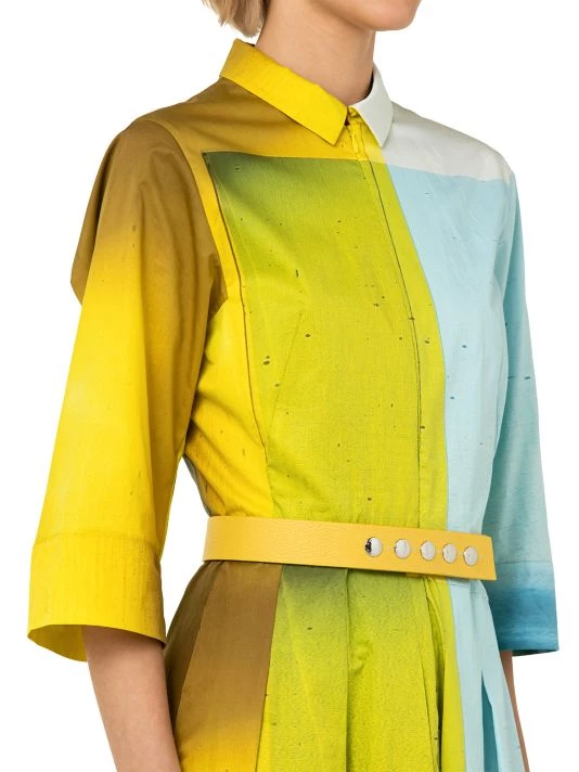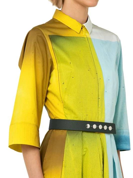 Colorblock panel shirt dress with a contrast studded belt and pleated skirt.