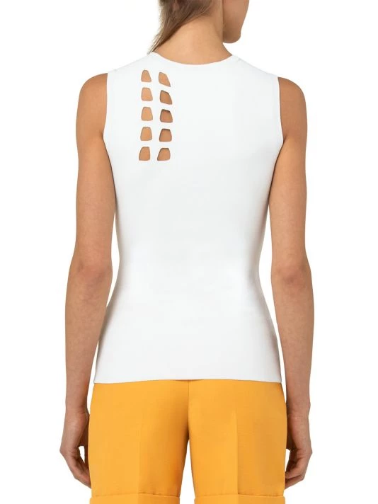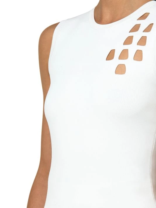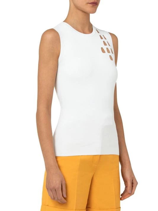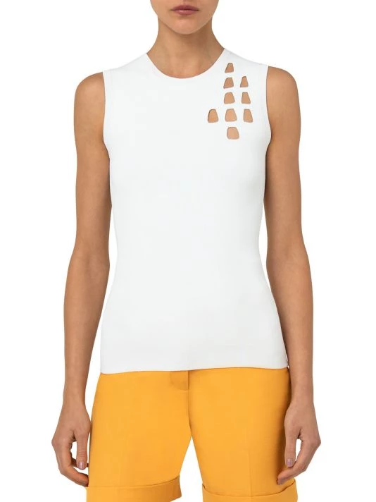 Trapezoid-shaped cutout detailing adds unexpected dimension to the shoulder of this stretch shell.