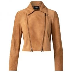 Constructed of luxe lambkin suede, Akris’ jacket is cut in a cropped silhouette. Structured seaming and an asymmetric zip front add dimension to this sleek style.