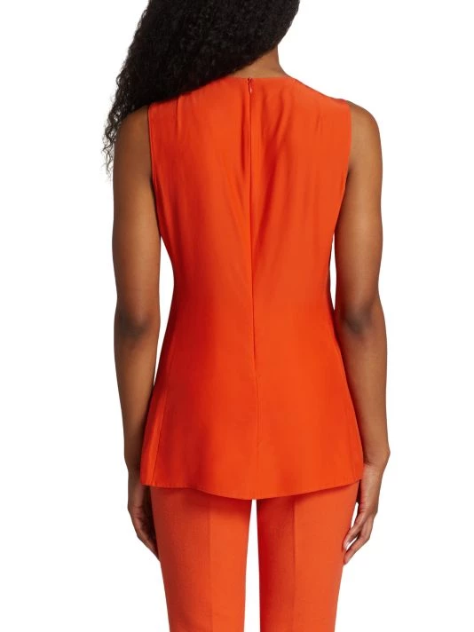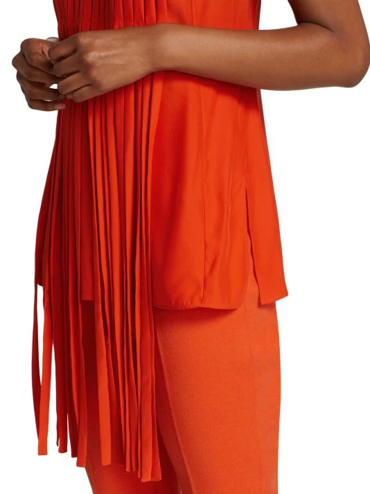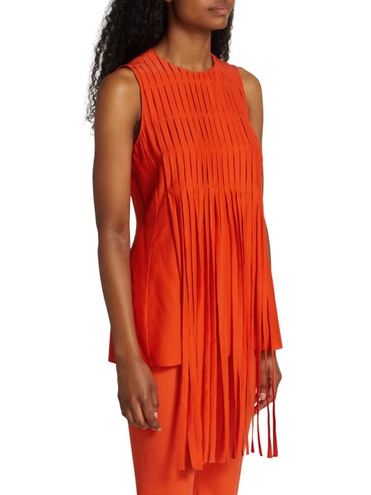 Akris’ longline top features a dynamic fringe draping from the waist. Cut in a sleeveless style, this design is enhanced with a crepe wool construction.