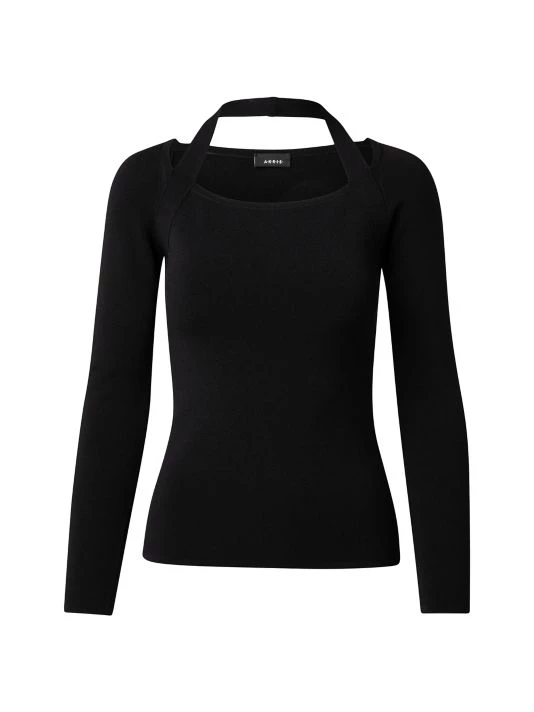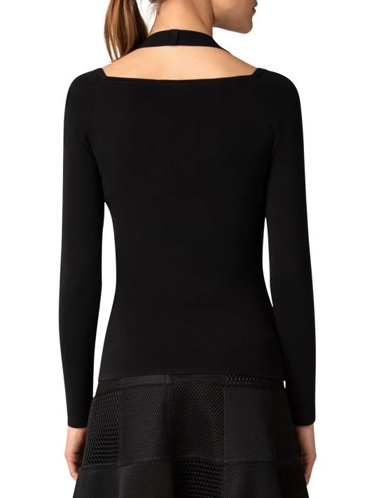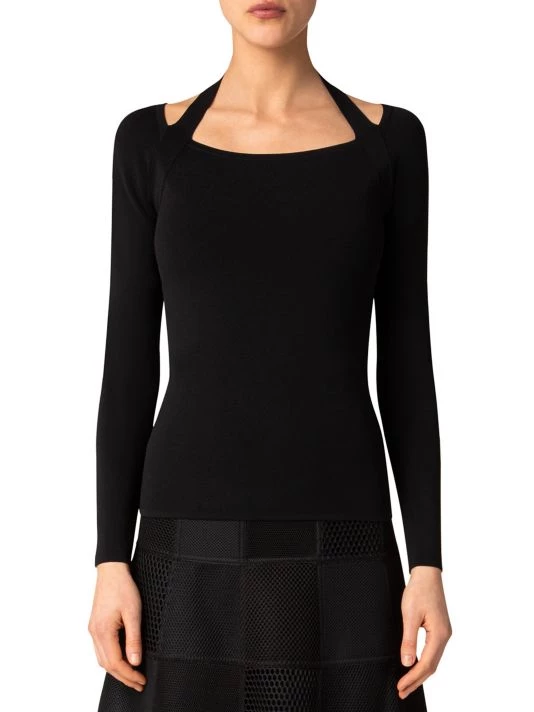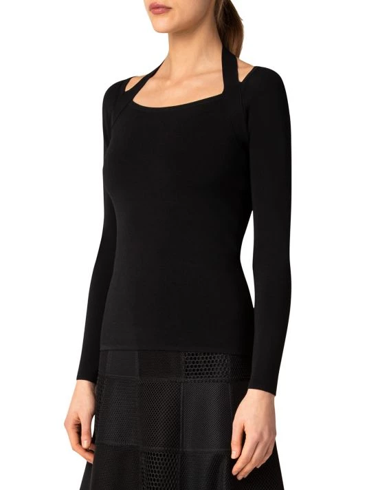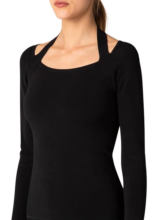 This cozy sweater skims the figure, cut with a swooping boatneck and halter strap.
