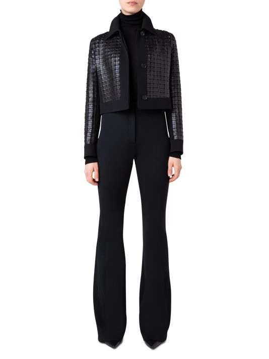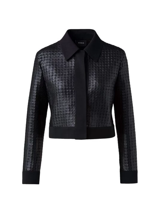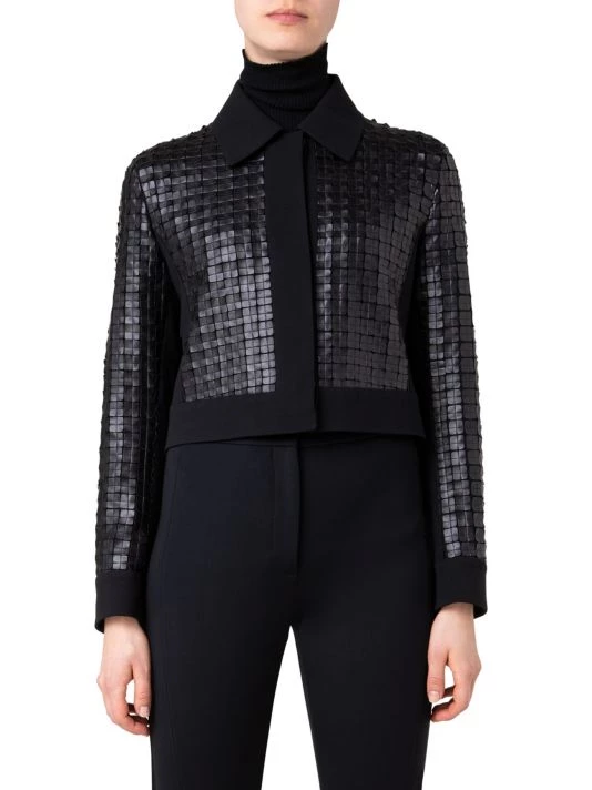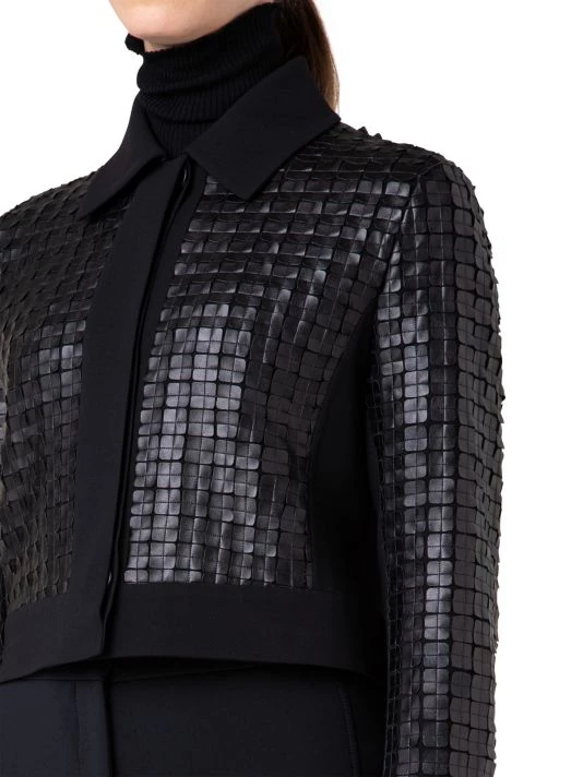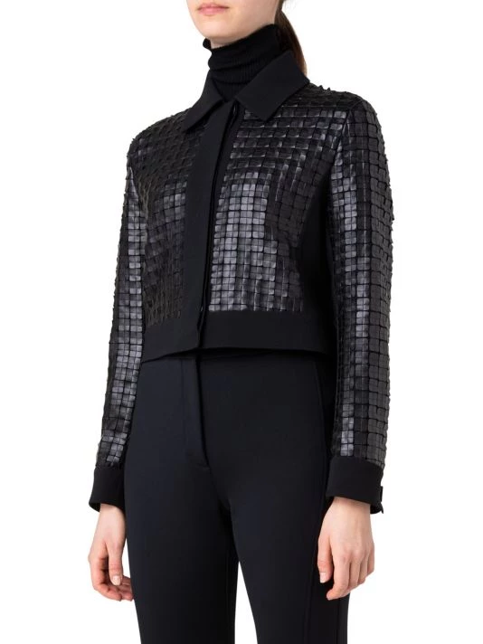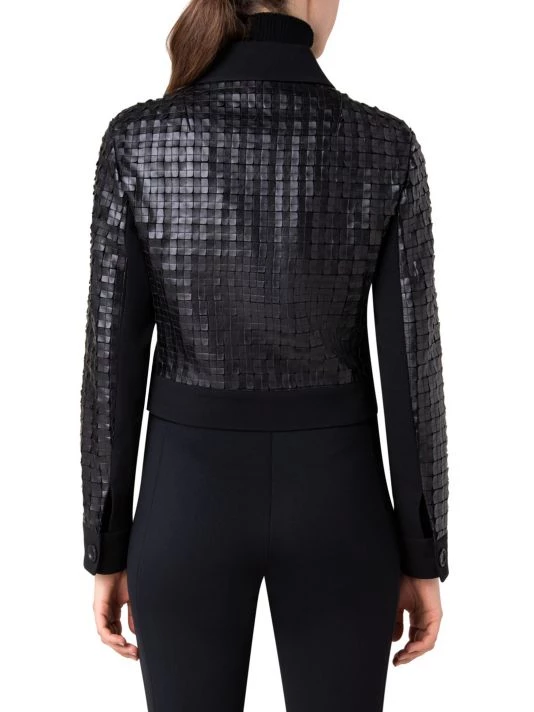 Akris’ Lewitt jacket is cut to a tailored fit, crafted from faux leather with a geometric grid texture and contrast trim.