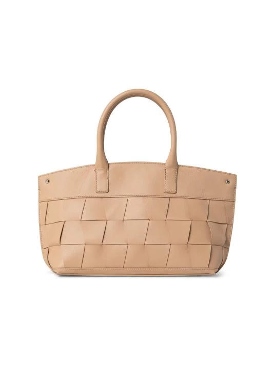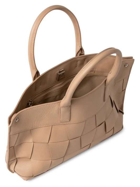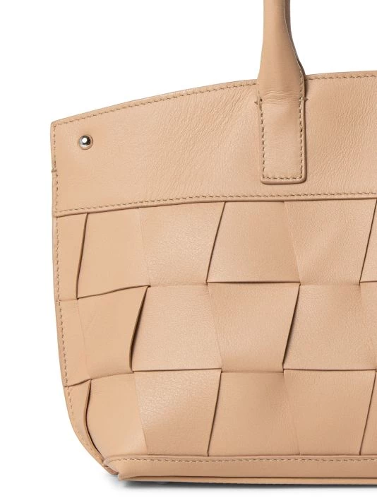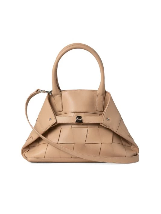 Woven trapezoid leather panels create this spacious messenger bag. Achieve three convertible looks: Rectangular shopper, pure trapezoid tote or signature messenger.