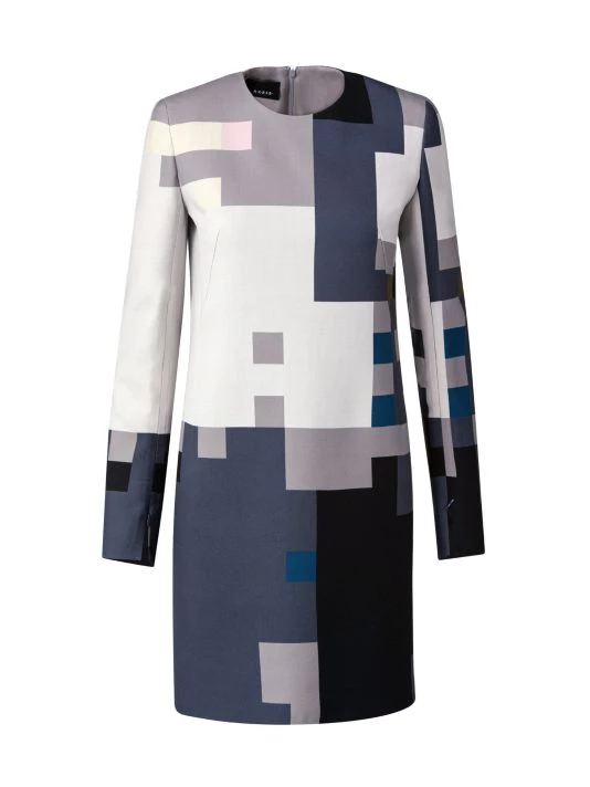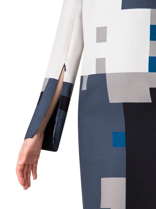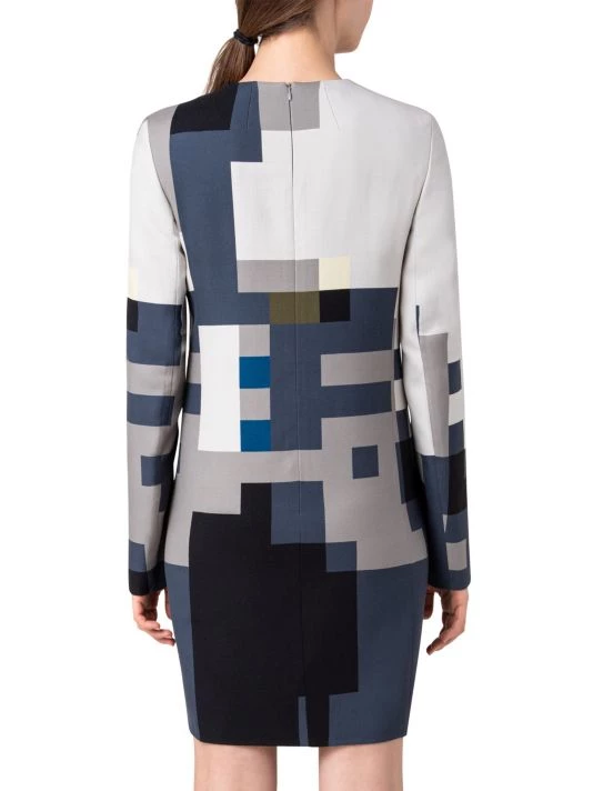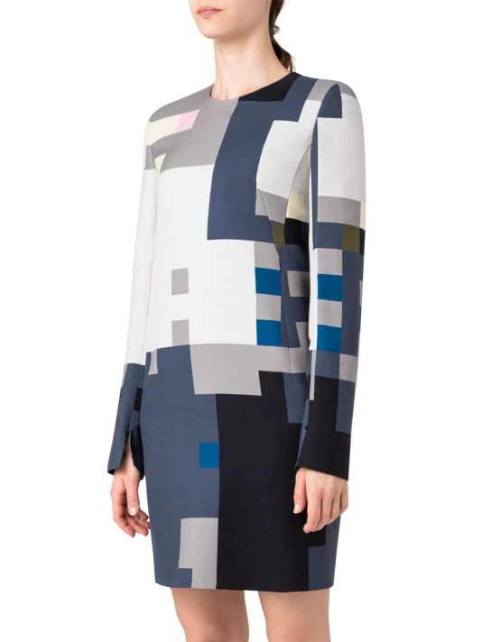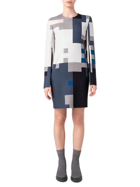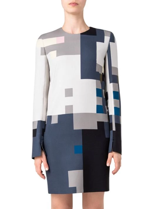 Akris presents a classic sheath dress styled with a sleek round neck and long sleeves. Decorated with an enlarged pixelated pattern, this design features side zip pockets and vented cuffs.