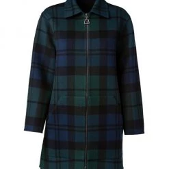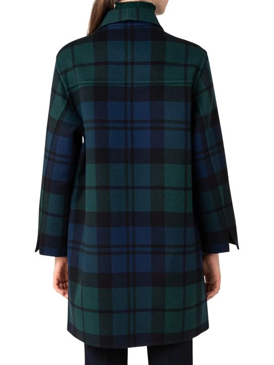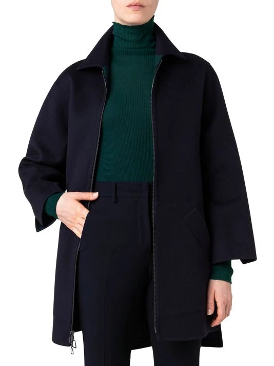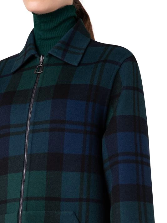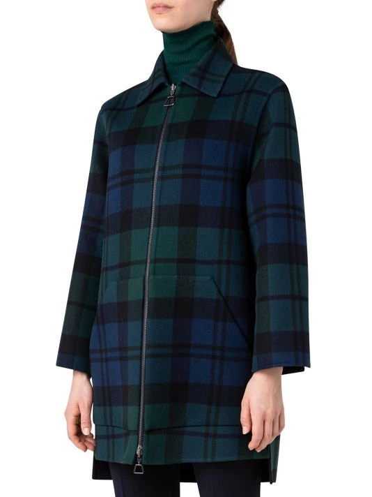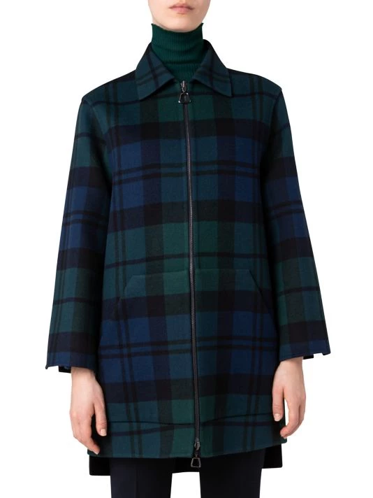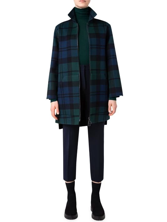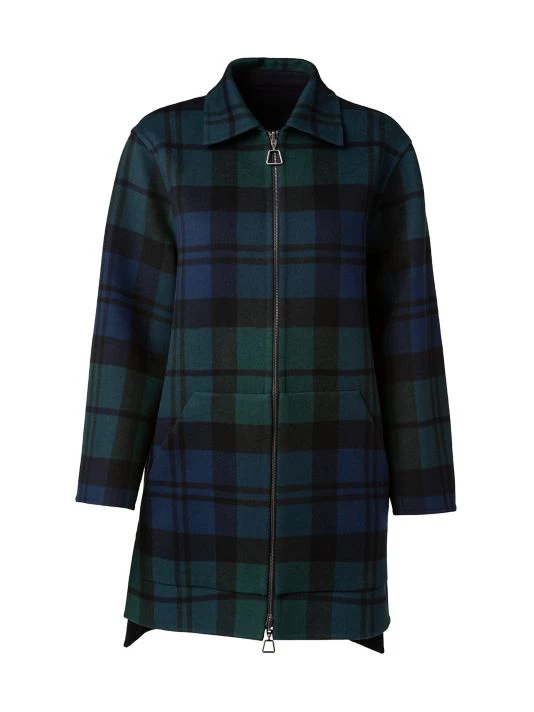 Akris’ zip-front coat is knit from cozy wool. Cut in a high-low silhouette, this reversible style offers a plaid or solid outer.
