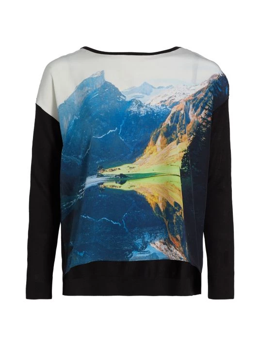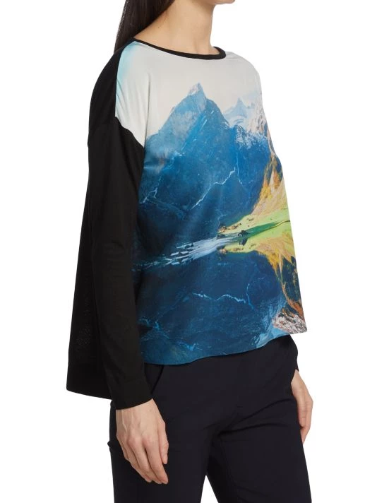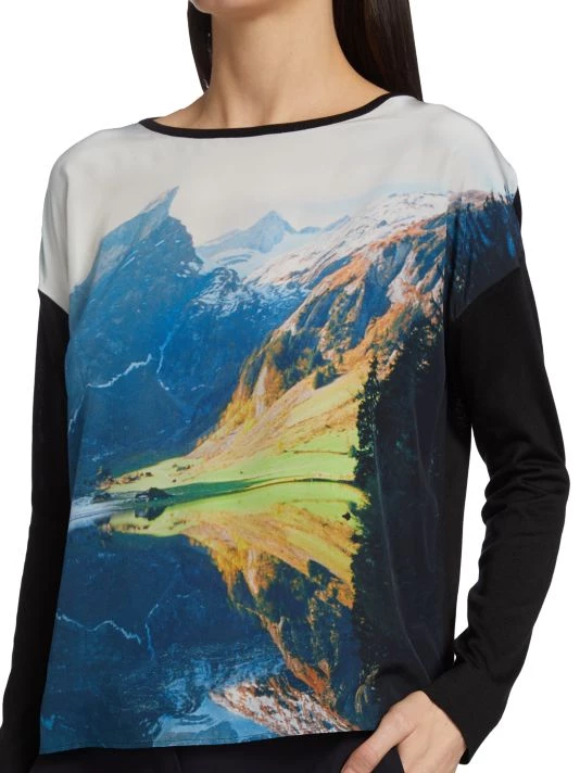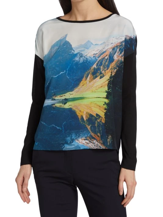 Founded in Switzerland in 1922, Akris continues to design luxurious pieces inspired by the picturesque town of St. Gallen. This top is crafted of silk with imagery of a mountain scene.