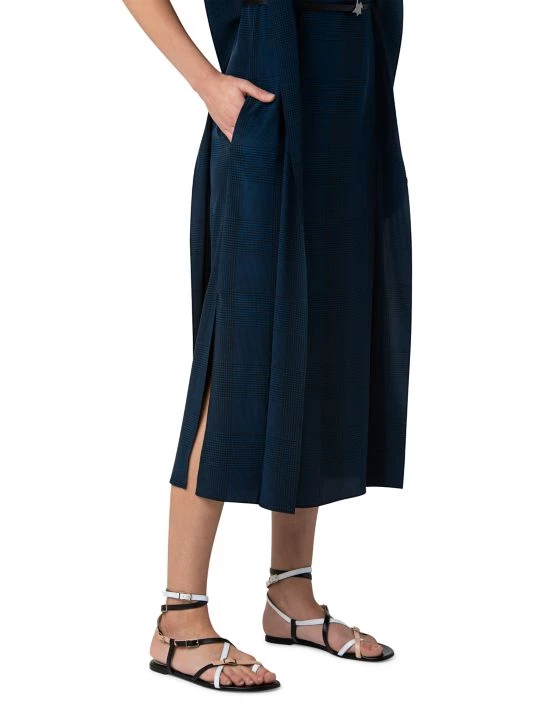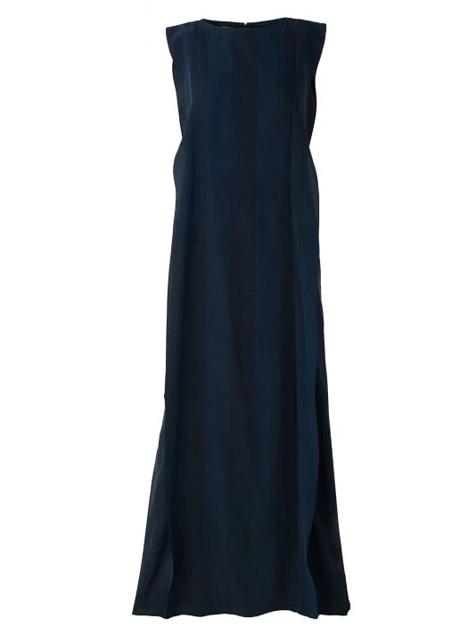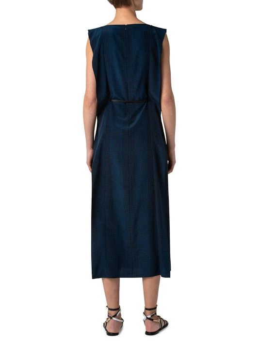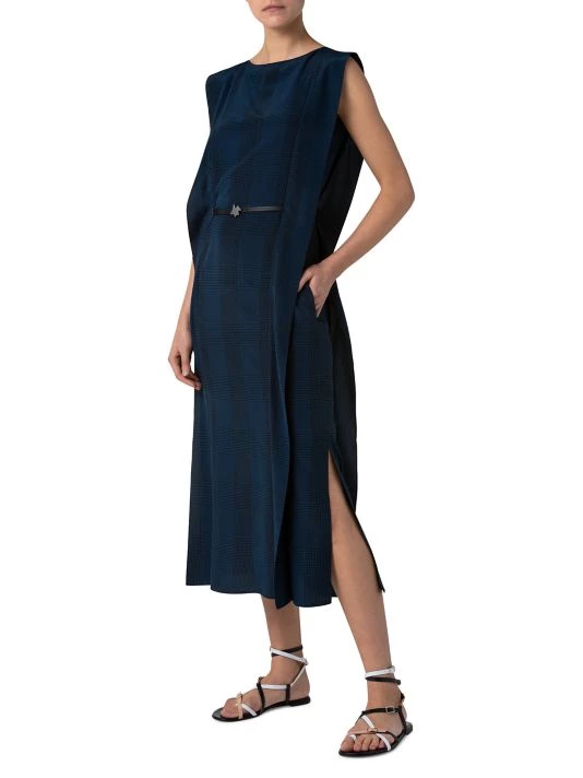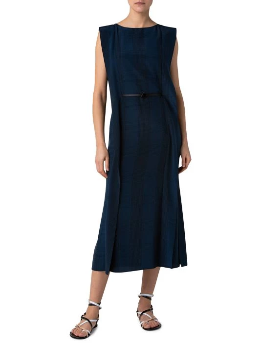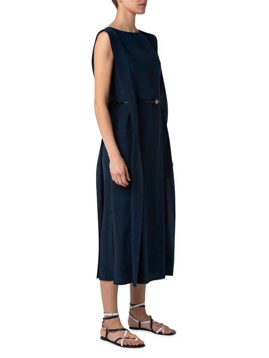 This sleeveless midi is finished with a polished tonal check and winged side panel pleated cut that’s cinched at the waist with a fine leather belt featuring a Kinderstern buckle.