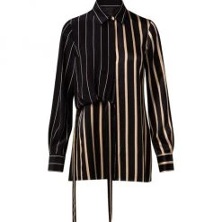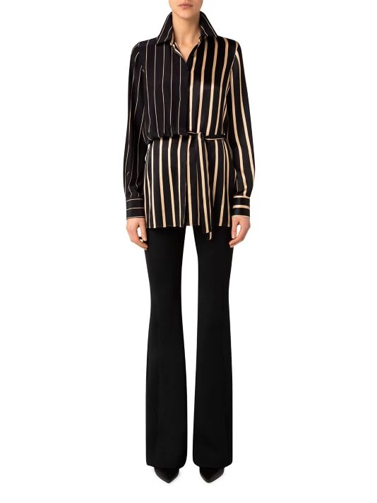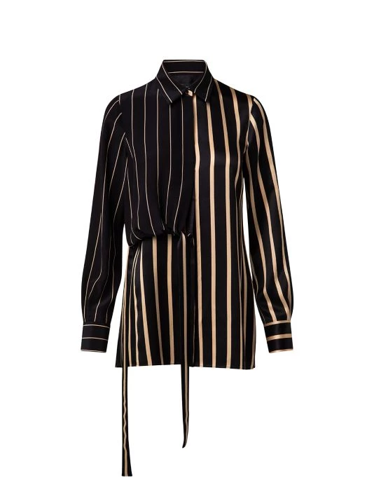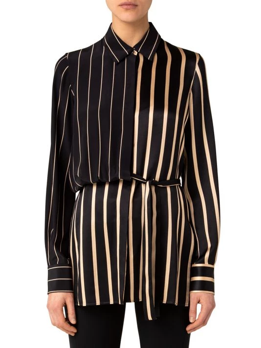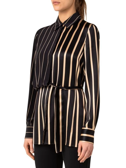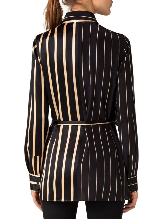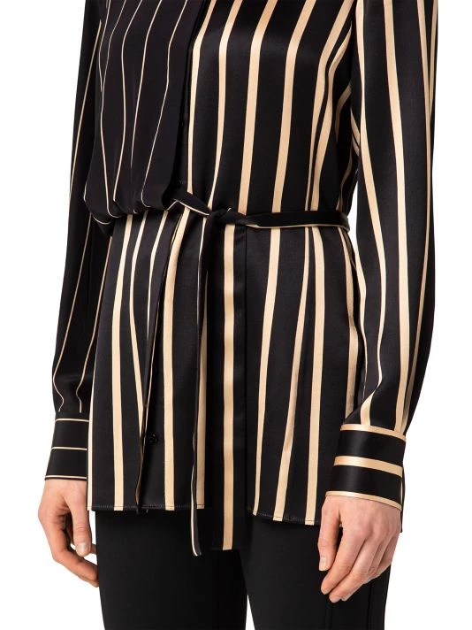 Crafted of soft silk, this striped tunic top showcases a blouson bodice cinched with a self-tie belt.