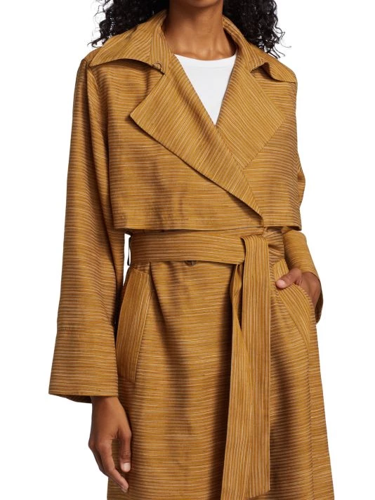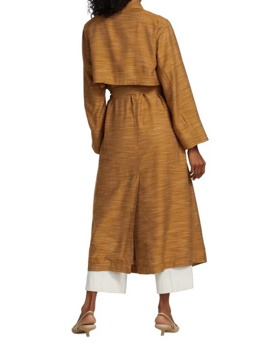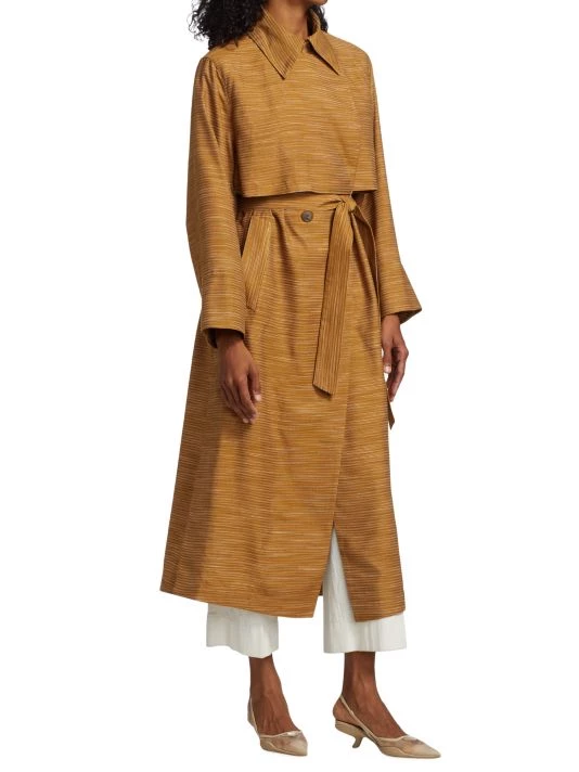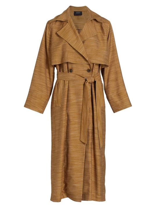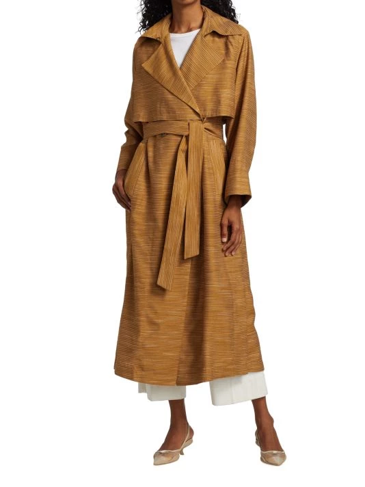This classic trench coat features a double-breasted style and self-tie belt, updated with chic space-dye print.