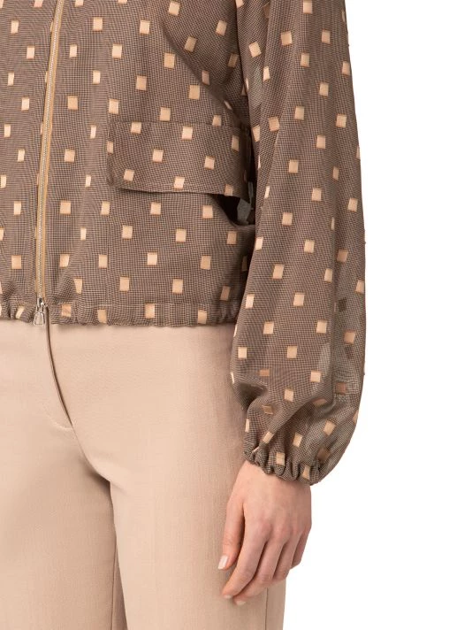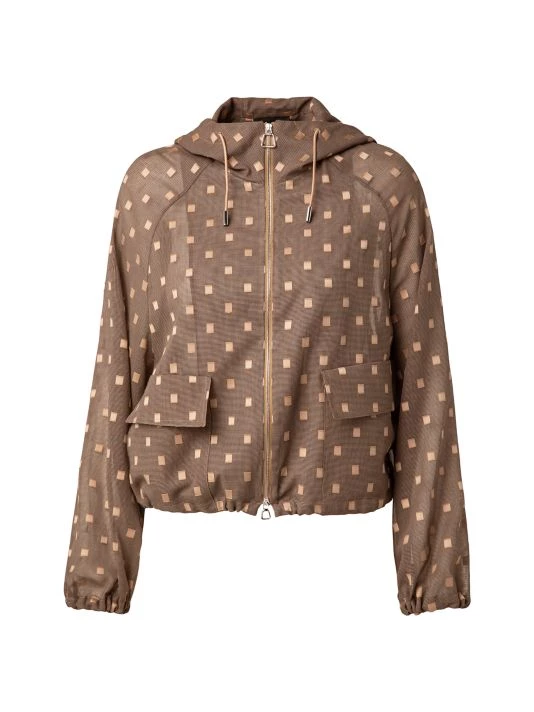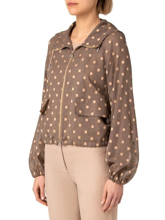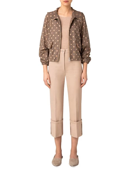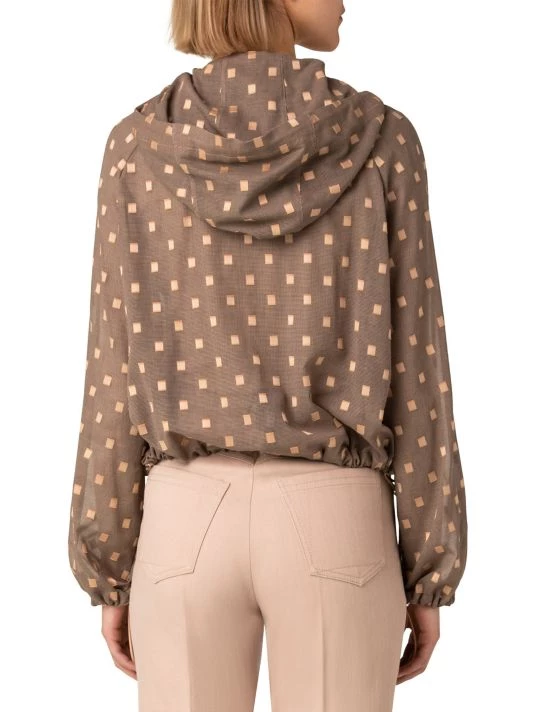 Cut in a cropped silhouette, Akris’ zip-front jacket features textured square-appliqué patterning. The piece boasts convertible styling with drawstring detailing at the hood and hem.