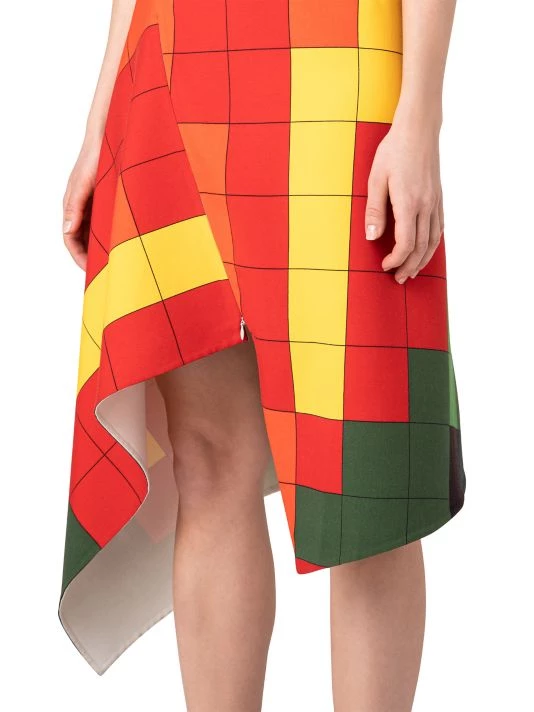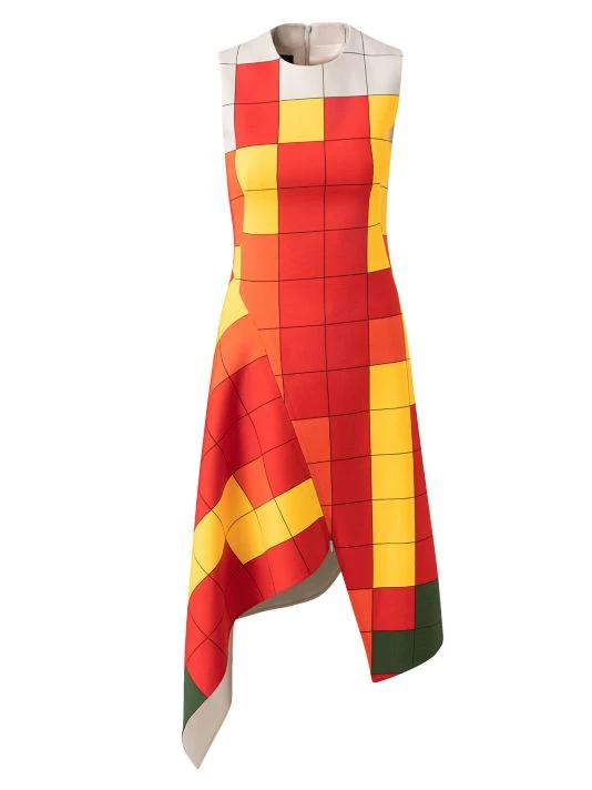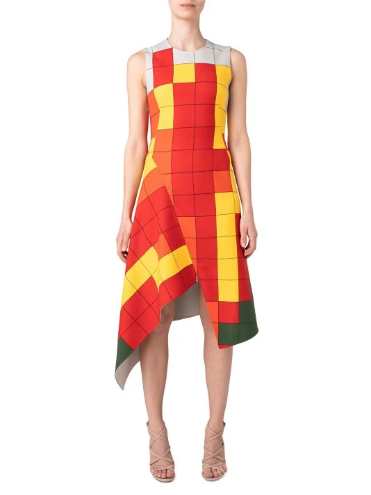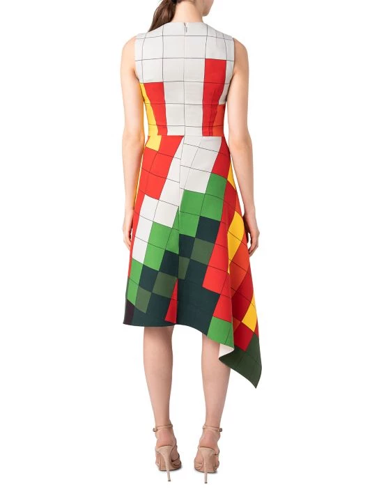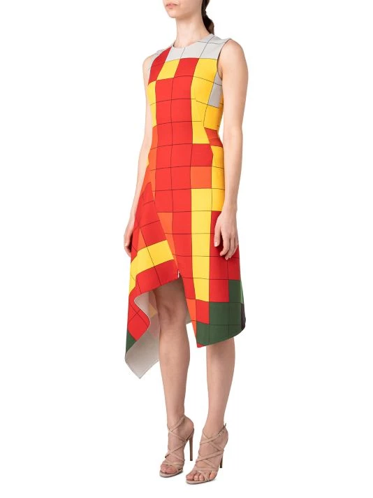 Boasting a vibrant tiled print, this Akris midi-dress evokes a playful design. This piece is crafted of double-faced wool blended with a touch of silk, draping elegantly at the asymmetric hem.