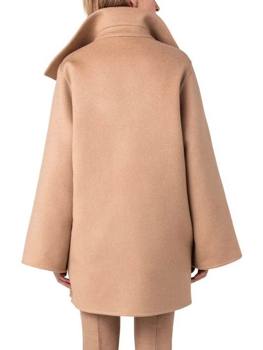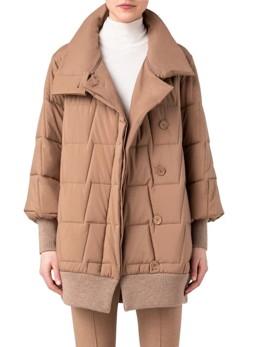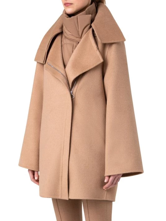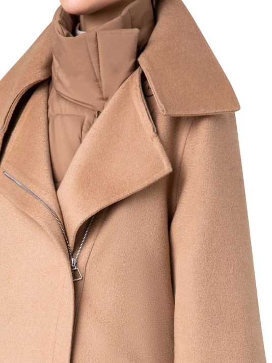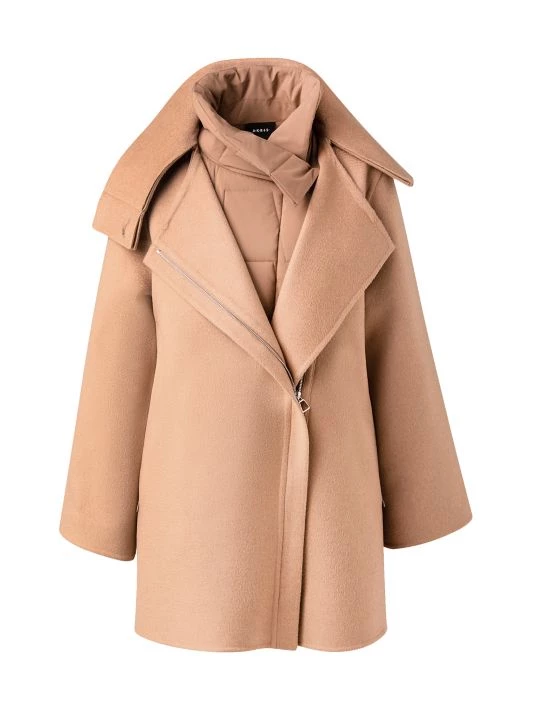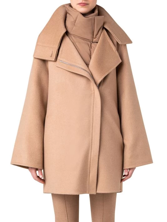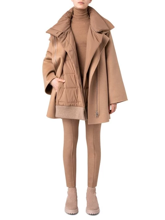 Akris’ cozy parka boasts a two-in-one design, fitted with a trapezoid quilted inner layer. Enhanced by soft camel hair fabrication, this look features a stand collar and asymmetric button closure.