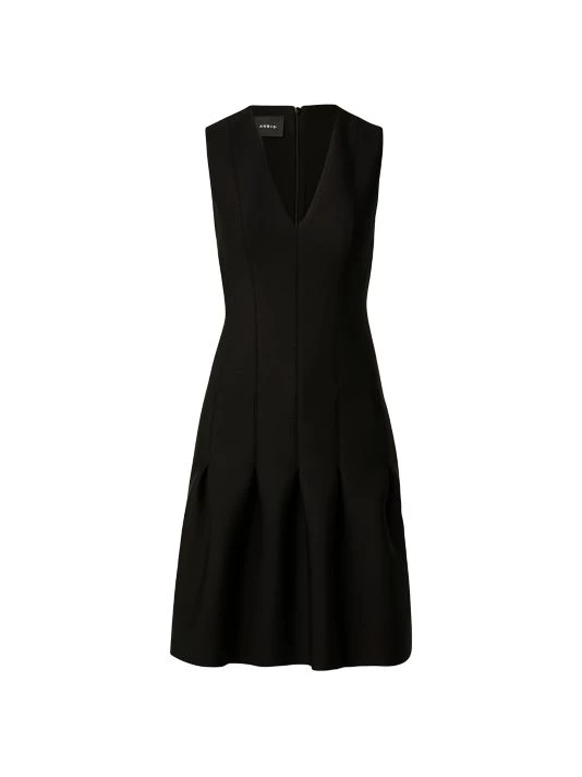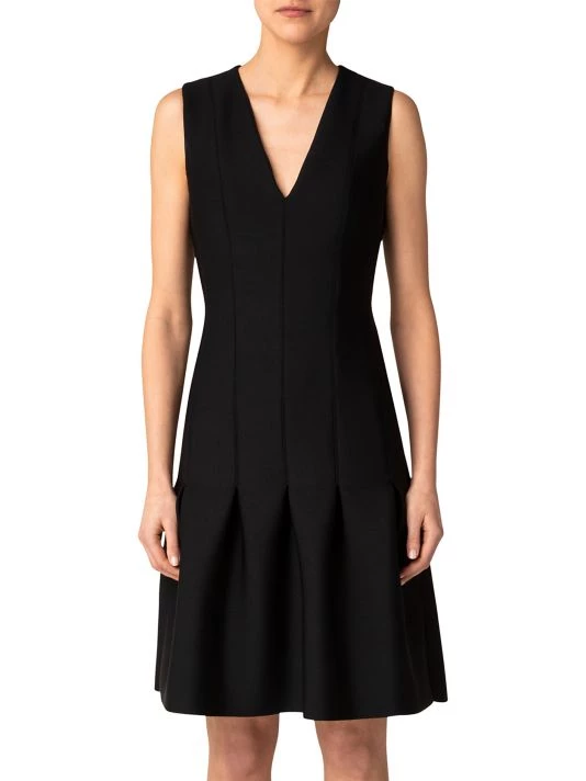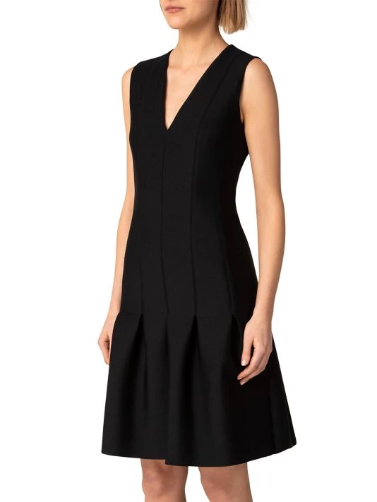 This chic V-neck dress from Akris is adorned with pleats at the waist and showcases a structural fit. Styled with a classic fit-and-flare silhouette, this piece features crisp lines and a minimalist design.